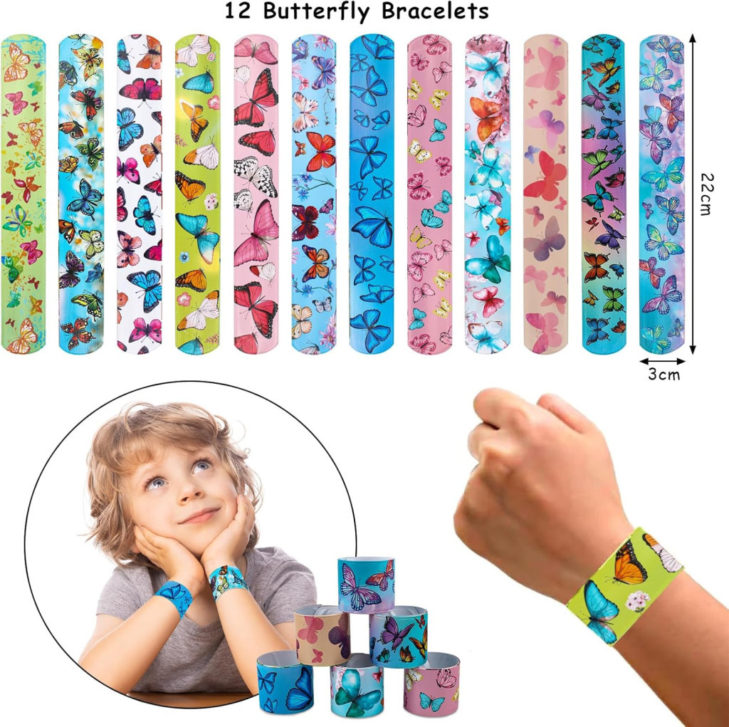 Táto čarovná motýlia párty sada obsahuje 12 darčekových vrecúšok, 12 náramkov, 12 nálepiek na tvár a 12 kľúčeniek – spolu 48 kusov. Motýlie motívy a rozprávkový dizajn vytvoria kúzelnú atmosféru ideálnu na dievčenské narodeninové oslavy, jarné podujatia alebo princeznovské párty.