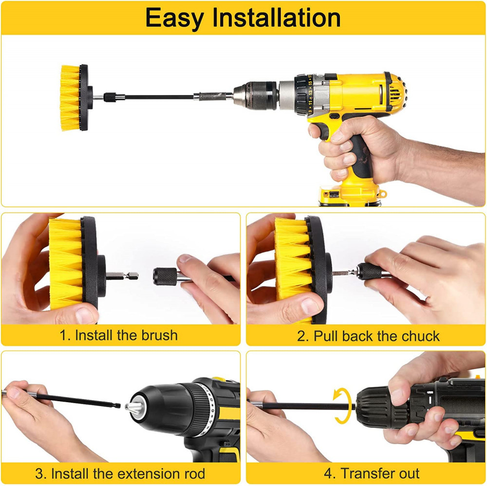Všetko, čo len musíte urobiť je, vybrať vhodný nástavec podľa povrchu a veľkosti, a potom už môžete začať čistiť. Zvolenú kefu nasadíte pomocou kovového nástavca do skľučovadla vŕtačky a pevne utiahnete. Potom len spustíte vŕtačku a pritlačíte k povrchu alebo materiálu na čistenie.