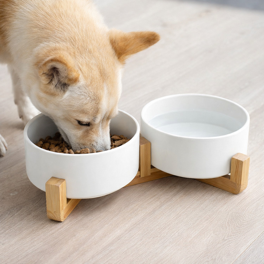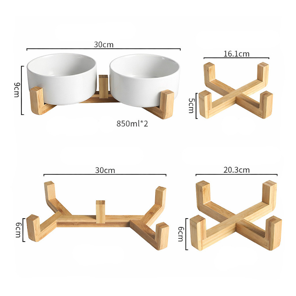 Dvojitá keramická miska pre malé zvieratá s bambusovým stojanom
