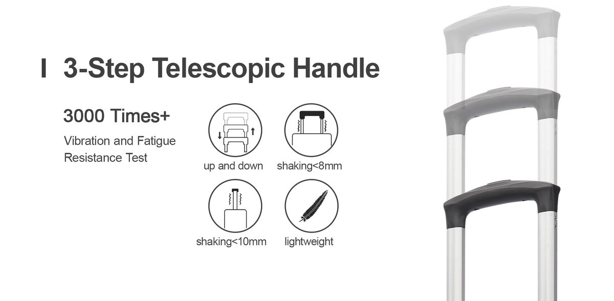 Kufor má teleskopickú rukoväť nastaviteľnú do troch rôznych výšok, takže každý ju môže pohodlne používať. Rukoväť prešla viac než 3000 testami vibrácií a zaťaženia, čo potvrdzuje jej stabilitu a odolnosť.