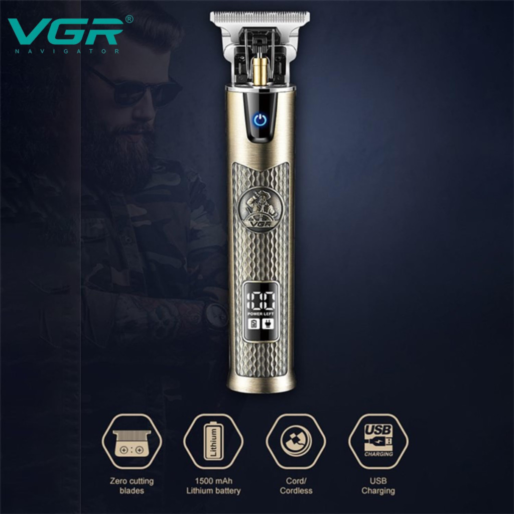 VGR V-983 Profesionálny bezdrôtový strihací a kontúrovací strojček – s T-nožom, 0 mm strih, 1500 mAh batéria, 200 minút prevádzky
